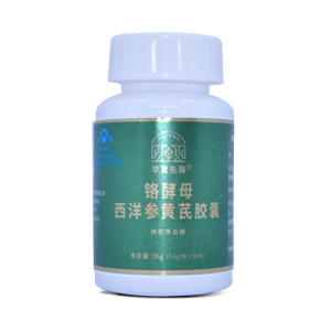 【主要原料】黄芪提取物、生地黄提取物、西洋参提取物、绿茶提取物、富铬酵母【标志性成分及含量】每100g含:总皂苷500.0mg铬8.0mg【保健功能】辅助降血糖【适宜人群】血糖偏高者【不适宜人群】少年儿童、孕妇、乳母【食用方法及食用量】口服。每日2次,每次3粒【规格】0.4g/粒
