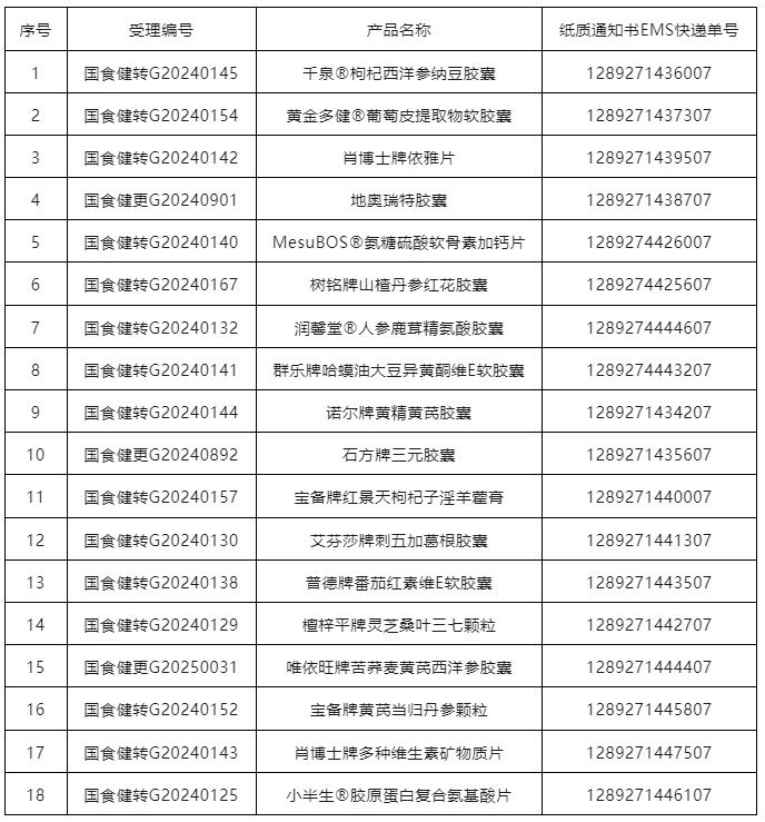 为进一步提高保健食品审评服务质量,推进保健食品全流程电子化申报和审评工作,方便申请人查询审评意见和提交注册申请材料,根据《保健食品注册与备案管理办法》及配套文件的规定,对已在保健食品注册管理信息系统提交电子版申请材料的变更、转让技术、证书补发类保健食品注册申请,发放电子审评意见通知书,同步发放纸质版审评意见通知书(收件地址信息为:申请人在保健食品注册管理信息系统填报的注册申请人地址及联系人、联系电话)。对于以下清单所列产品,申请人可凭注册账号和密码在保健食品注册管理信息系统(网址:https://xbjspzc.gsxt.gov.cn/regist_enter/)查询打印审评意见通知书,按照电子或纸质版审评意见通知书要求,在规定时限内提交补充材料或复审材料。