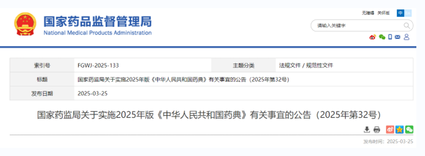 国家药监局关于实施2025年版《中华人民共和国药典》有关事宜的公告